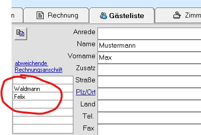 Klicken Sie im Rechnungsbereich auf „Adresse ändern“ , gelangen Sie in die Gästeliste. Hier können Sie entweder einen vorhandenen Gast wählen oder einen neuen Gast anlegen und diesen dann übernehmen.