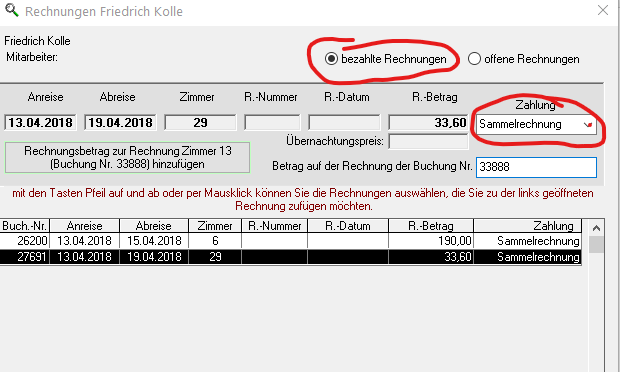 Dann wählen Sie „bezahlte Rechnungen“ und ändern Sie dann die Zahlung von „Sammelrechnung“ auf „offen“, dann ist diese Buchung wieder eine eigenständige. In der Hauptrechnung müssen die Zeilen manuell gelöscht werden. Nach Korrektur können Sie diese erneut zur Hauptrechnung hinzufügen, falls gewünscht.